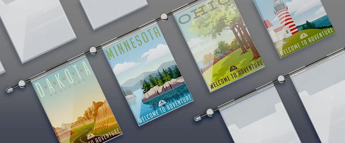 Hook-On Acrylic Holders — Featuring a molded top for secure attachment to 6mm or 10mm diameter rods, these are ideal for horizontal rod setups or cable-suspended displays. They support large formats up to 30″ x 40″ and maintain a sleek, professional look.