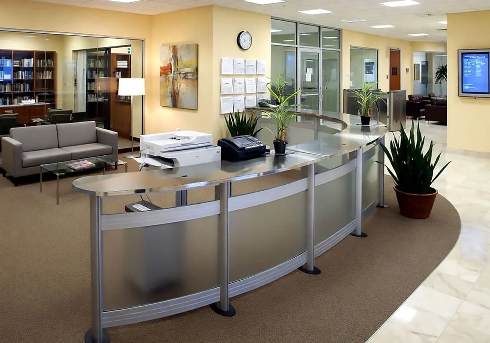 - Reception Desks and Counters — Pre-fabricated or custom made lightweight and durable counters and desks that provide a reception point or work surface with lockable storage.
