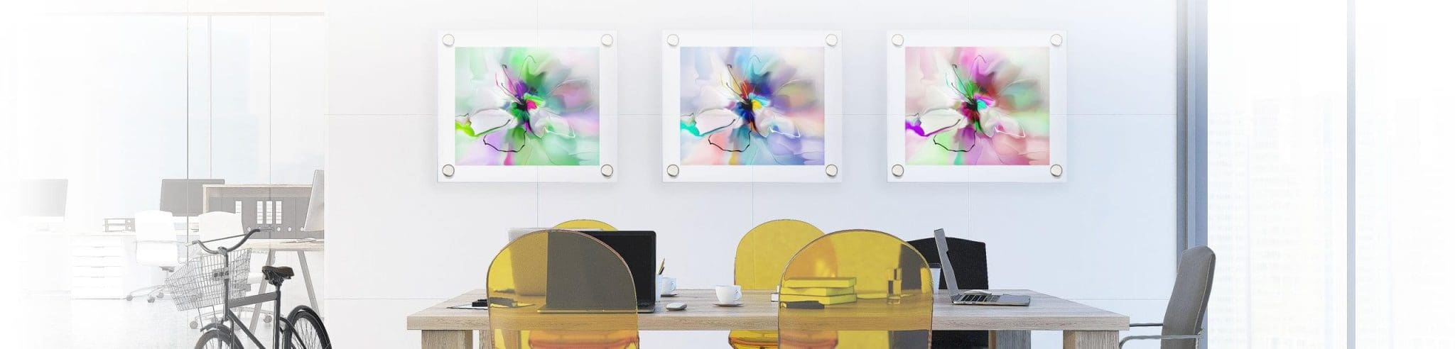 A great new way to showcase your art and photography — prints or photographs are framed between two pieces of acrylic and mounted to wall with standoff supports / spacers. The sandwiched acrylic panels allow for prints to be easily changed.