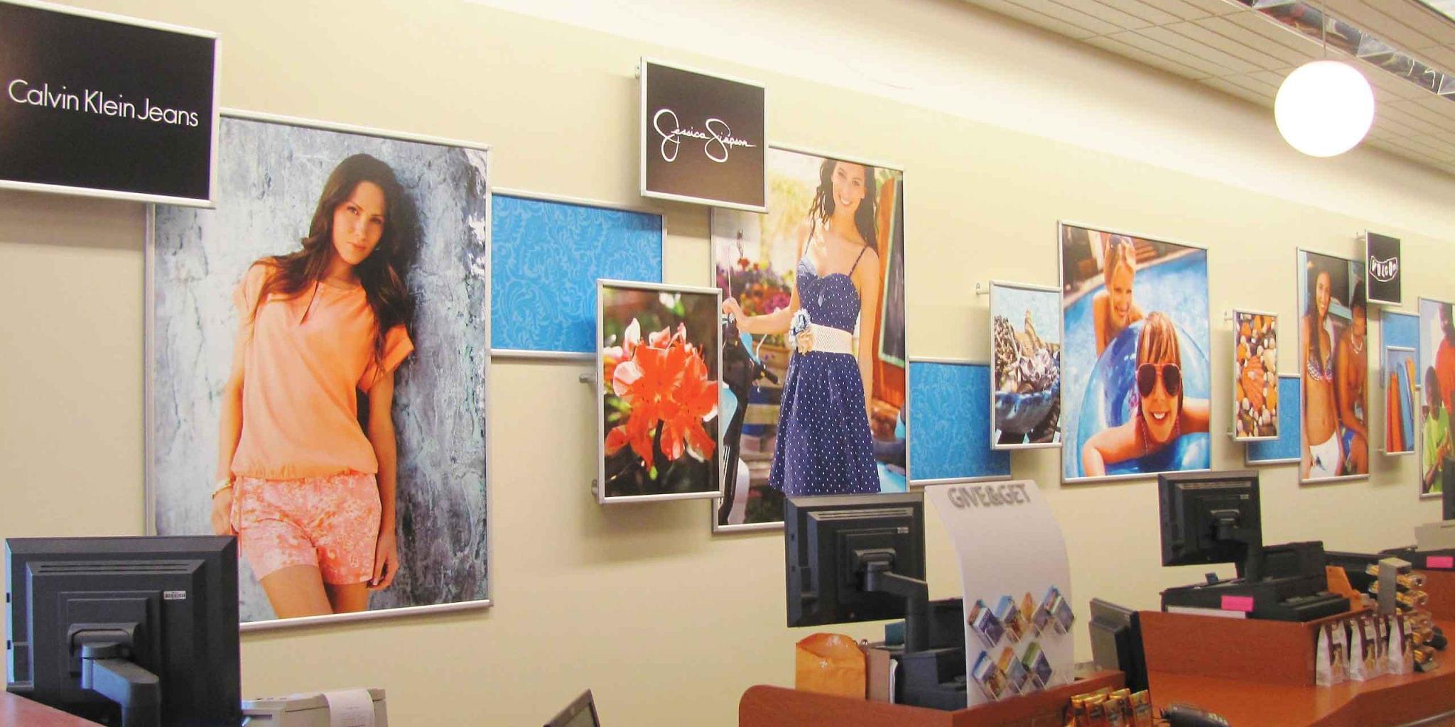 Cable suspended poster information displays for walls and windows. Provides a quick and easy way to change information.