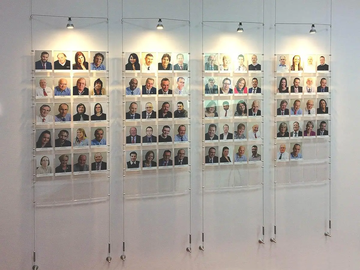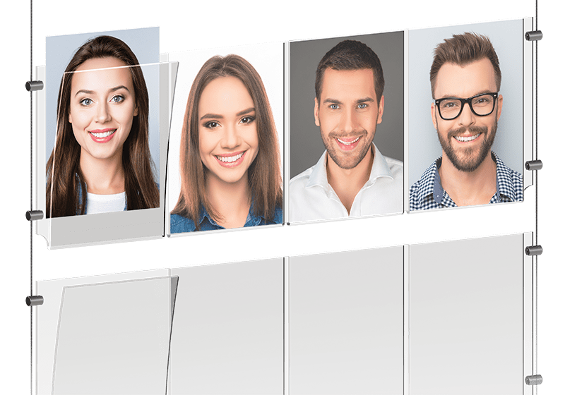 Cable/rod suspended multi-pocket easy access holders are available in a variety of sizes and configurations, designed for side-by-side display of multiple inserts like pictures, signs, or graphics. Depending on the size of the inserts, these holders are offered in triple or quad configurations for smaller inserts, and single or double configurations for larger inserts. A key advantage of these multi-pocket acrylic holders is their reduced need for cable/rod mounting hardware, which lowers the overall cost of the display setup. These holders facilitate quick and easy updates to displayed information; prints or graphics can be inserted from the top, similar to placing a document in a file folder. Whether used singly or in multiples, suspended from cables or rods, these acrylic holders enable the creation of eye-catching display presentations.