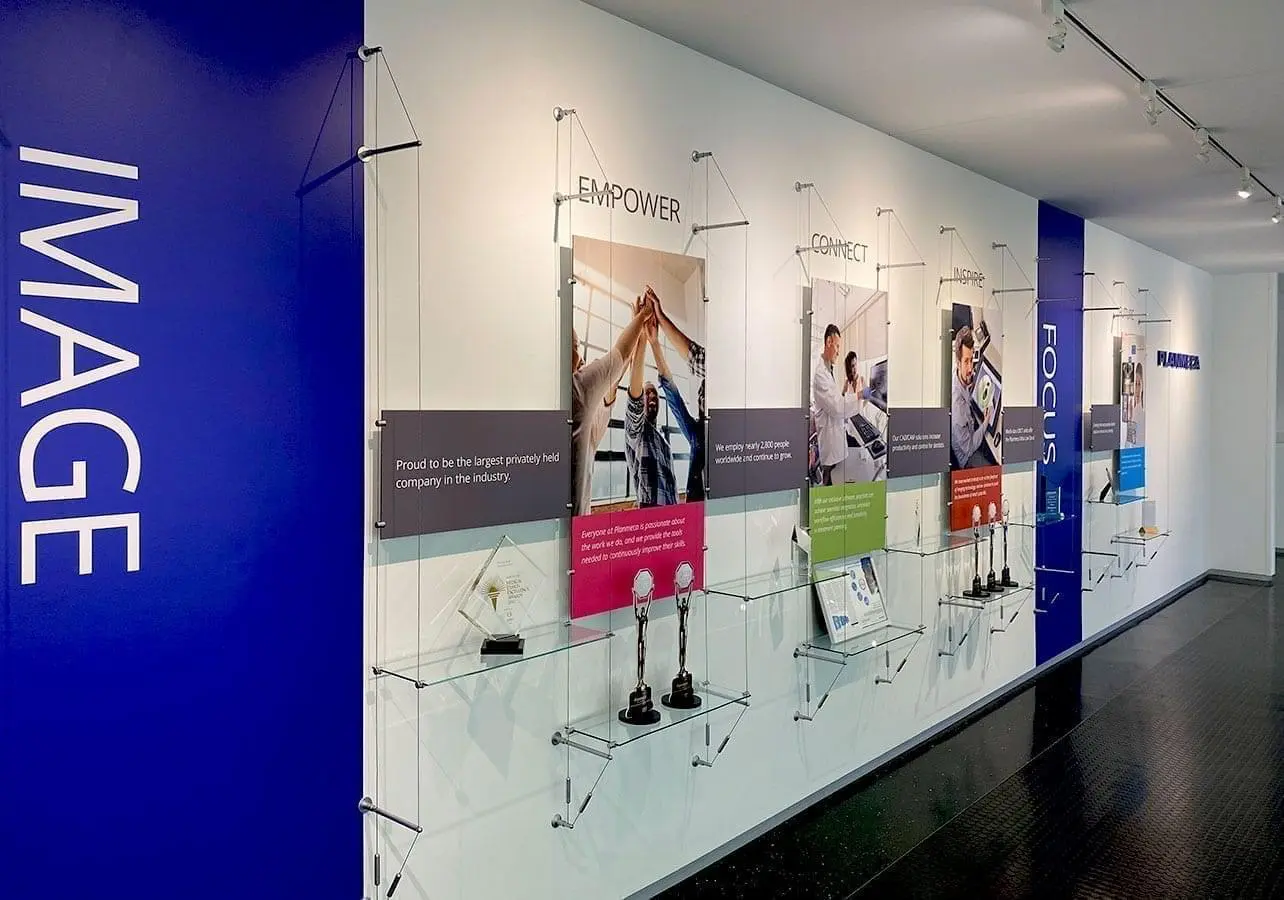 Cable/rod suspended easy access pockets are a quick and easy way to create high impact poster and information displays. Standard kits are available in wall-mounted or ceiling-to-floor suspended configurations. The easy access acrylic pockets/holders are precision laser cut out of clear acrylic sheets and pre-folded to accommodate various inserts. They have polished edges and the 1/8 inch thick acrylic stock guarantees excellent durability and longevity. We offer our holders in portrait or landscape orientations and in a variety of sizes. Changing out the prints or graphic inserts is performed by sliding the image down into the holder from the top, as simple as using a file folder. Add single or multiple acrylic holders to cable or rod display systems to create stunning poster or graphic display presentations.