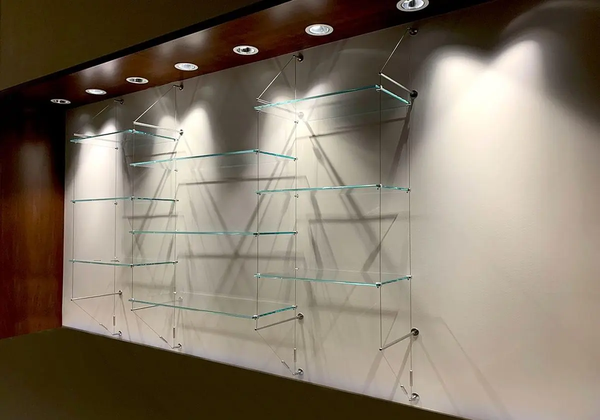Our cable/rod suspended product display shelves offer a sleek, contemporary aesthetic that seamlessly integrates with both traditional and modern design elements. Ideal for various applications, they can serve as open-style display shelves in kitchens, decorative partition shelving for space separations in living rooms, or space-saving storage shelving in retail environments. Their minimalist design ensures they do not obstruct light or views and can be easily reconfigured for new design layouts. We offer these shelves in kit configurations, complete with suspension hardware and a choice of acrylic or glass shelves, available in standard thicknesses of 3/16″ and 3/8″ for tempered glass, and 3/8″ and 1/2″ for acrylic, with options for thicker acrylic shelves (3/4″ or 1″) available upon request. These shelves are perfect for displaying collectibles, merchandise, photos, or promotional products in windows, on interior walls, or within glass cabinets.