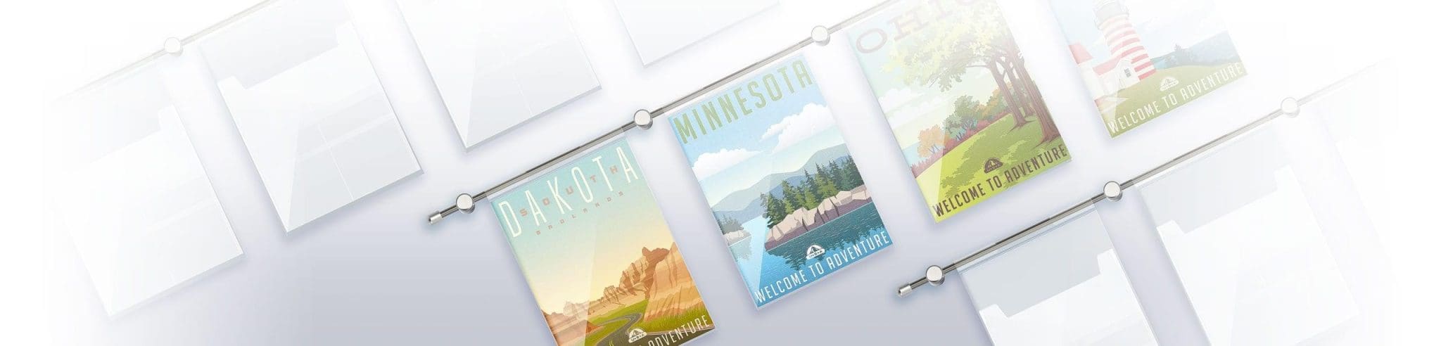 Hook-on acrylic holders come in few popular sizes to accommodate for letter, legal, or other standard poster-insert formats. Rods are mounted to the wall or suspended on cables in multiple rows at various heights and can display acrylic holders in both portrait or landscape configuration…