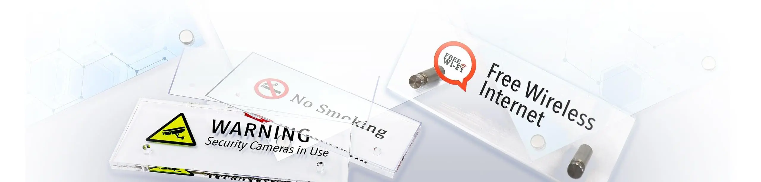 Acrylic Sign Blanks are designed for use with our sign/panel standoffs, projecting standoff supports, edge-grip supports, desktop standoffs, and cable/rod suspensions. They are available in a range of sizes, thickness and shapes. Standard blanks are made of clear and non-glare acrylic for use as wall/door signs or name plates with interchangeable printed inserts. Blanks can be used with permanent vinyl text and graphics, laser etching, or direct-to-surface printing are also available. Acrylic blanks can be supplied in few other surface finishes and colors.