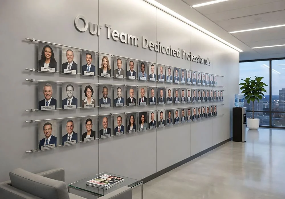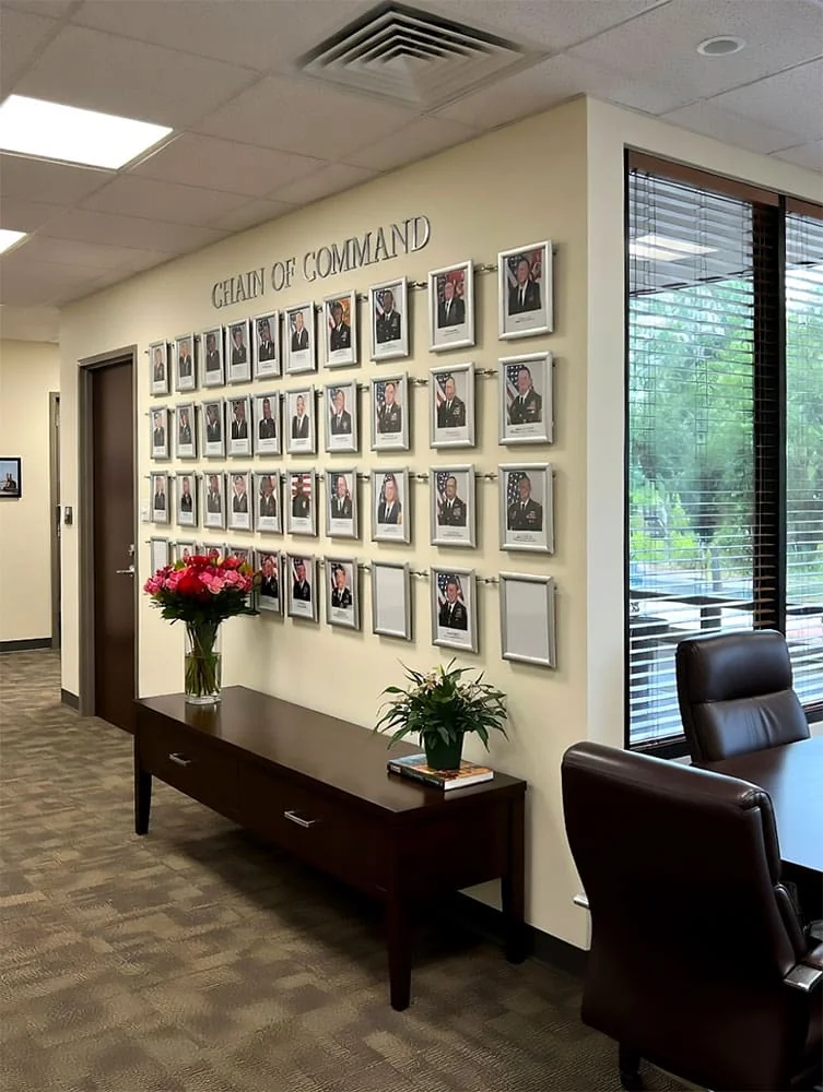 – suspended framed artwork and photographs from aluminum rails/tracks attached to ceiling or wall.
