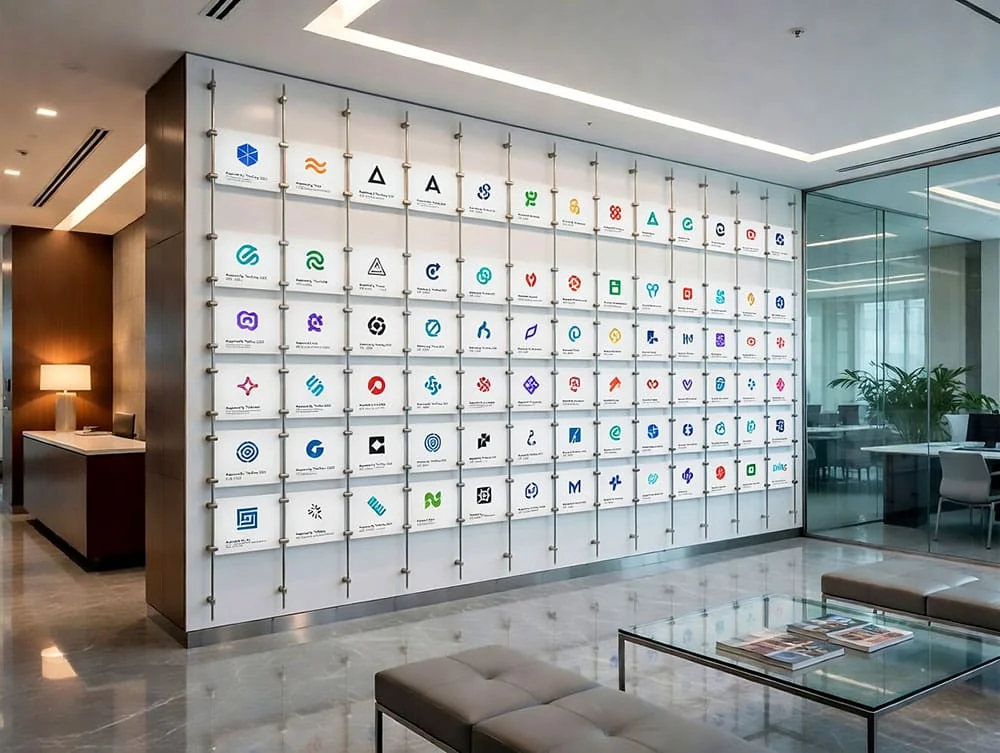 – suspended and wall-mounted signage, logo panels, decorative screens, vinyl banners, and large format graphics.