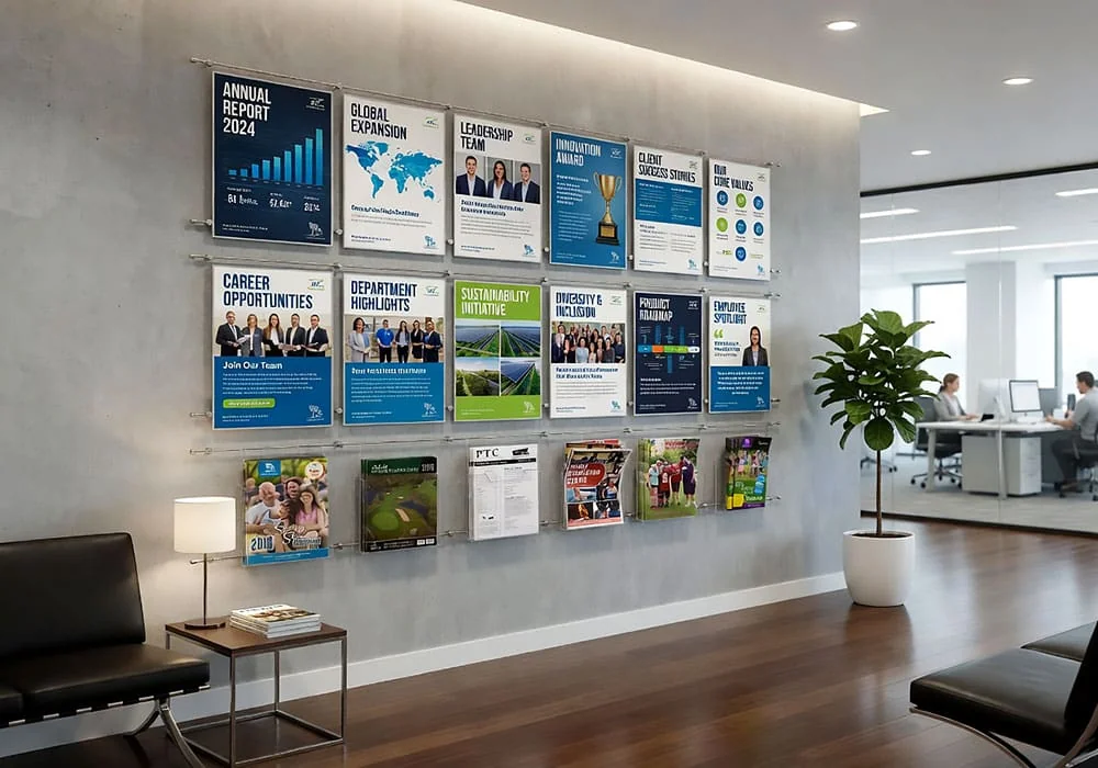 – suspended or wall mounted photo presentations, info/poster or graphic displays that require frequent updates.