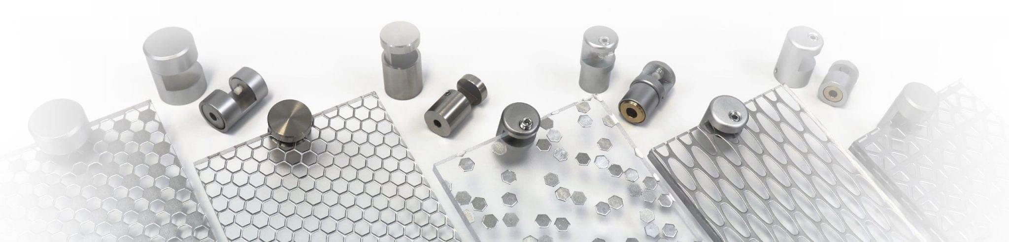 Edge-grip standoff supports are a practical and innovative hardware solution for sign and panel mounting. The standoff capability provides a simple and elegant way for affixing various types of materials to an infinite variety of substrates such as wood, gypsum, concrete, glass, aluminum profiles, steel studs, etc. Edge-grip standoffs are ideal for mounting plaques, display and logo panels, directional and informational signage, company directories, donor recognition and corporate wall displays, decorative glass panels, and more. The edge-grips do not require drilling holes into substrates — they allow the panel to be gripped from the sides or top and bottom. These supports are manufactured of high-grade aluminum, brass or stainless steel for durability and can be used with acrylic, glass, wood or metal substrates.