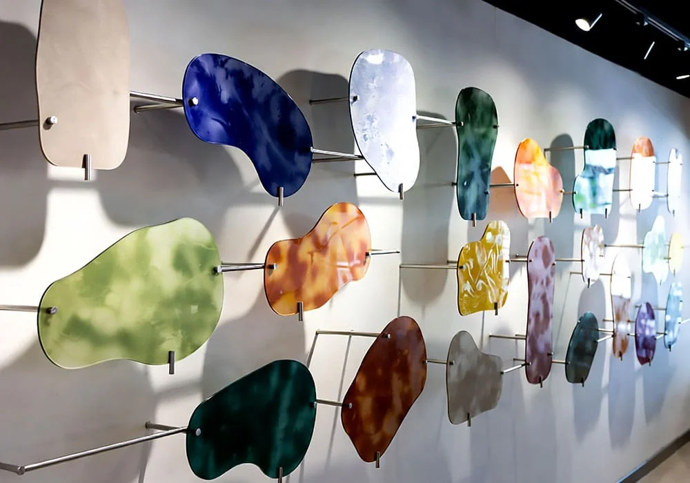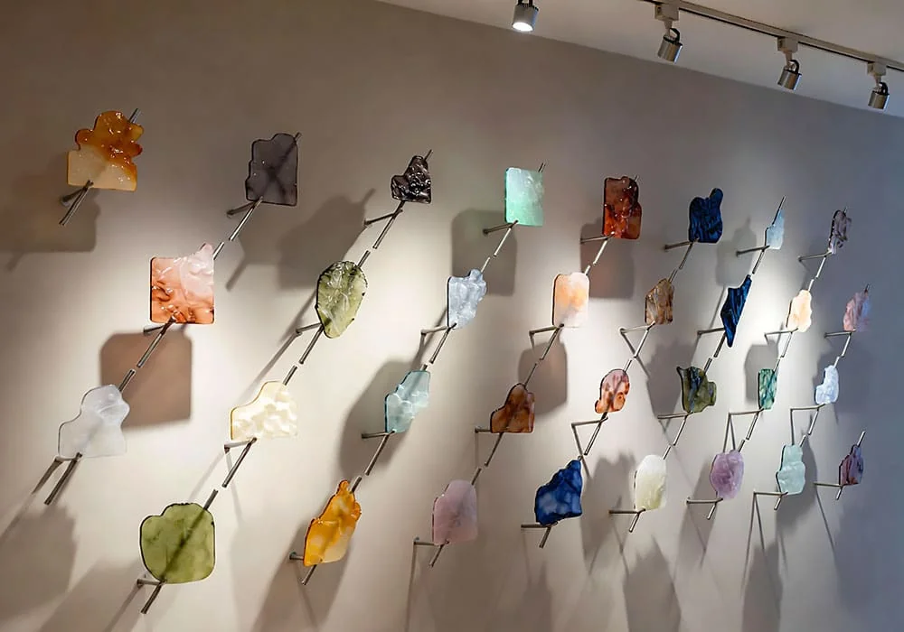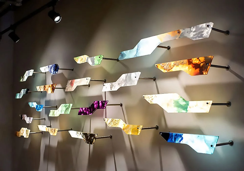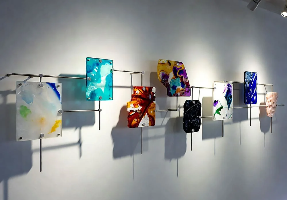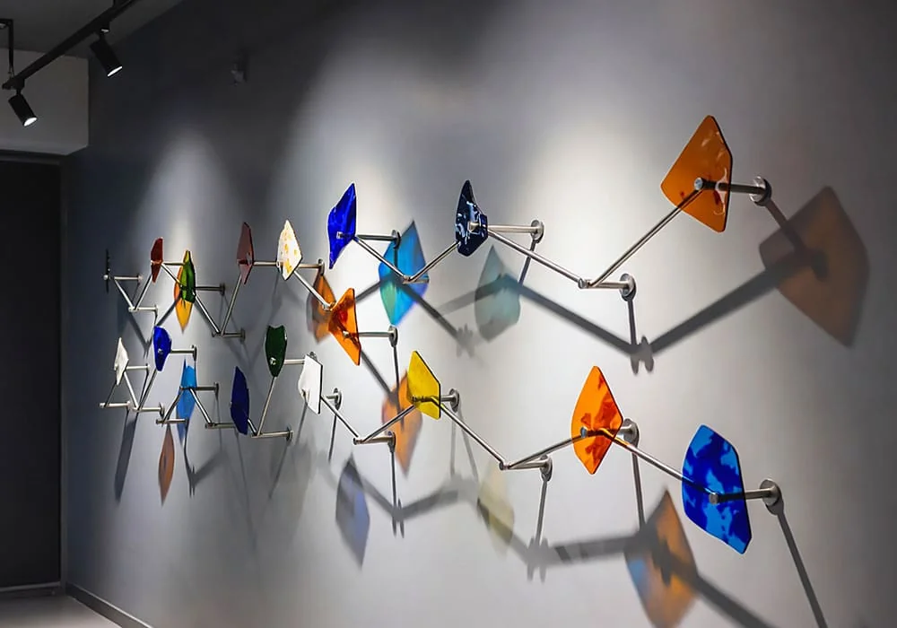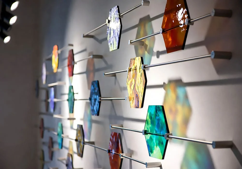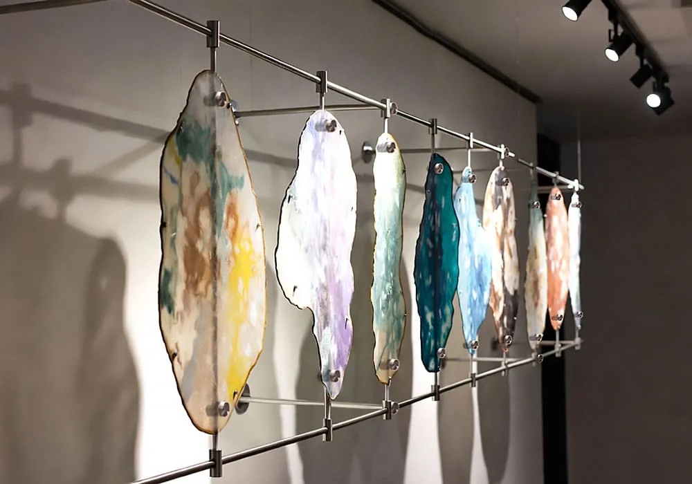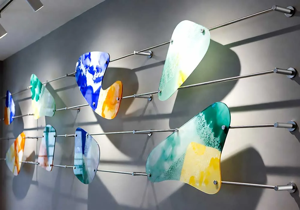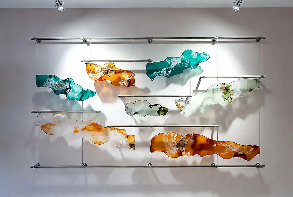 Whether suspending a single large abstract panel or creating a gallery wall of varied glass elements, our systems emphasize simplicity, originality, and maximum visual impact.