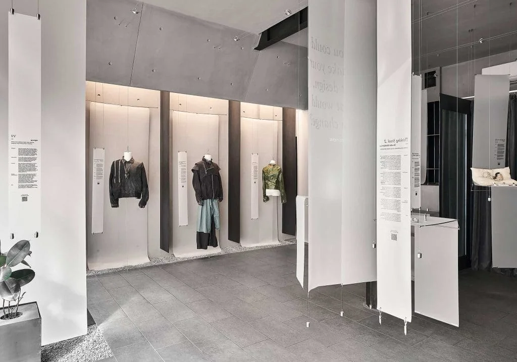 What made this exhibition truly stand out? The seamless integration of Nova Display’s innovative cable hanging systems, which turned the space into a versatile, flowing gallery that flawlessly accommodated the most unusual and sculptural items on display. From soft-sculpture dragons crafted in deerskin to multifunctional furniture pieces and vintage-inspired wool coats, the designers’ works demanded a display solution that was as artistic as the pieces themselves. Nova’s premium cable systems—engineered from solid brass and stainless steel—provided the perfect foundation, allowing for adjustable, tensioned suspensions that adapted effortlessly to the store’s brutalist architecture.
