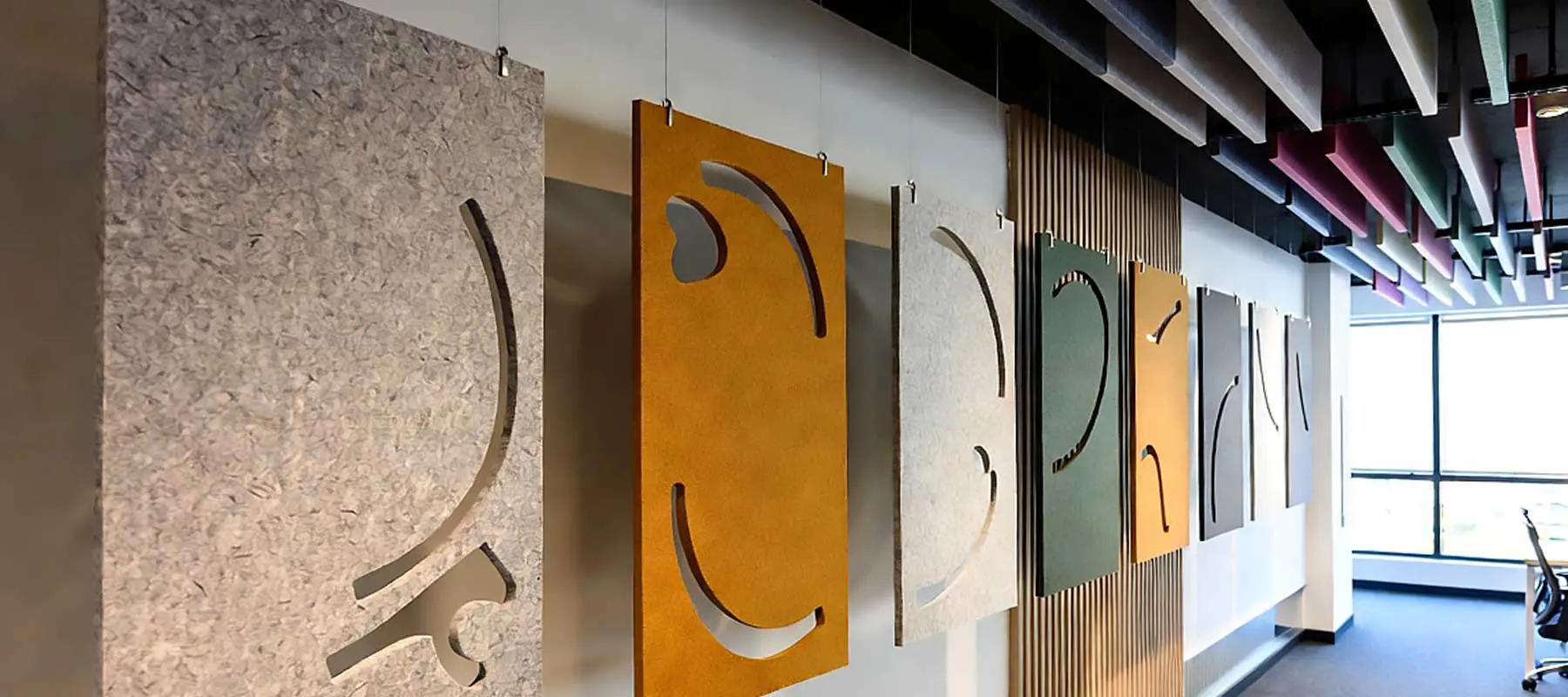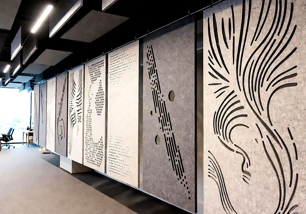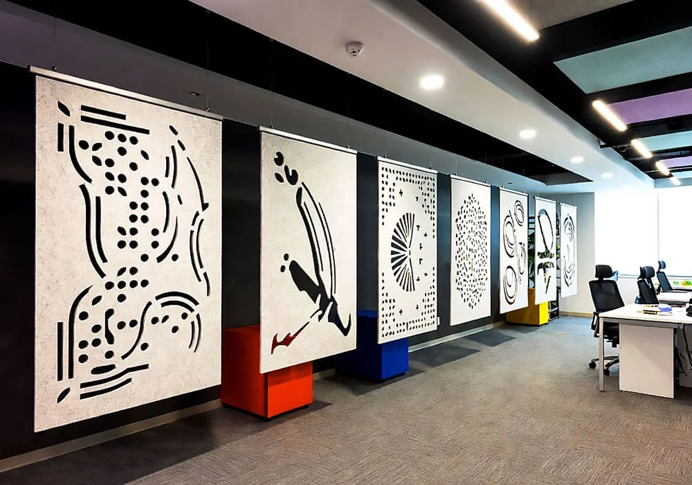 • In a bustling coworking space, 3mm cable-suspended acoustic felt panels created quiet pods, enhancing focus while adding vibrant color accents.