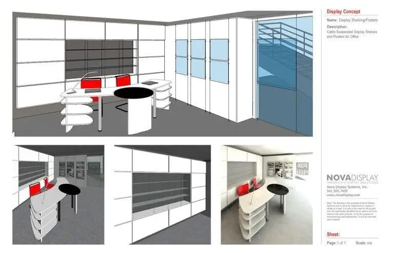 Cable Suspended Display Shelves and Posters for Office.