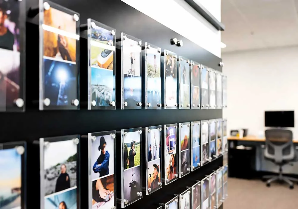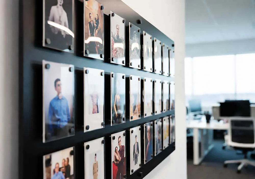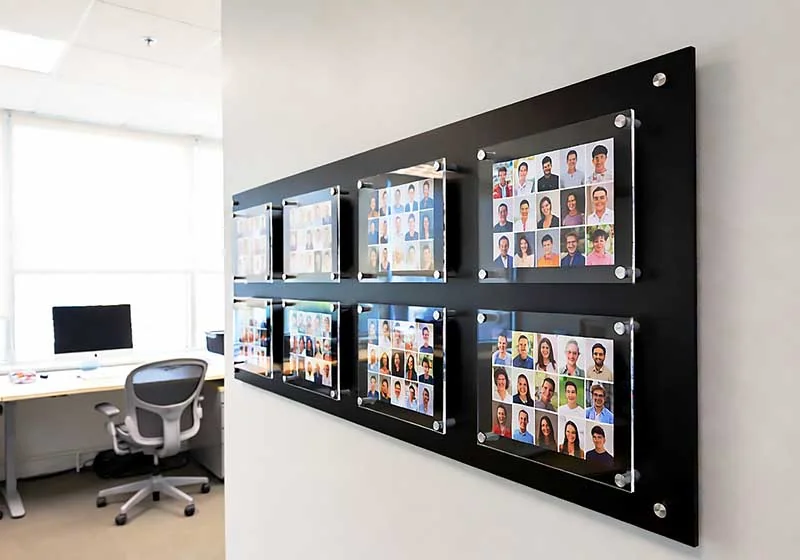 Custom Collage Frame — Grid-arranged acrylic frames mounted to a wide back panel using flush caps, enabling tool-free photo swaps. Ideal for busy spots like offices or stores needing quick changes.