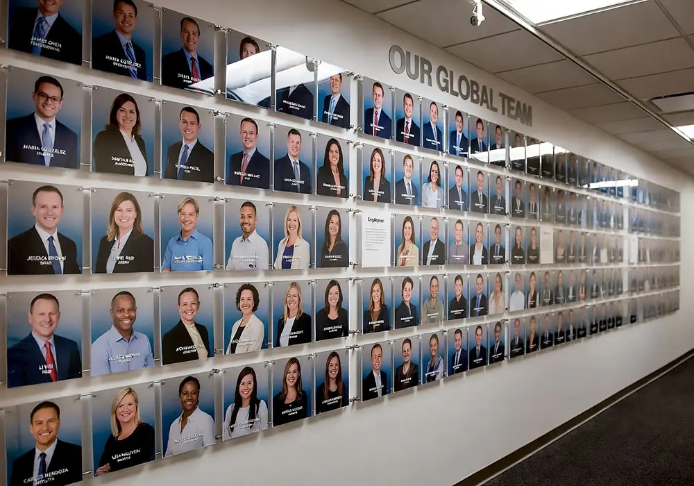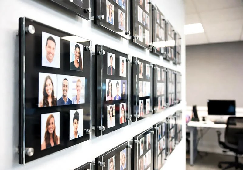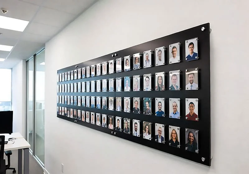 Employee Photo Wall Display with Vertical Single-Rod System – Sandwich acrylic frames with optional sign plaques or dimensional lettering for corporate recognition