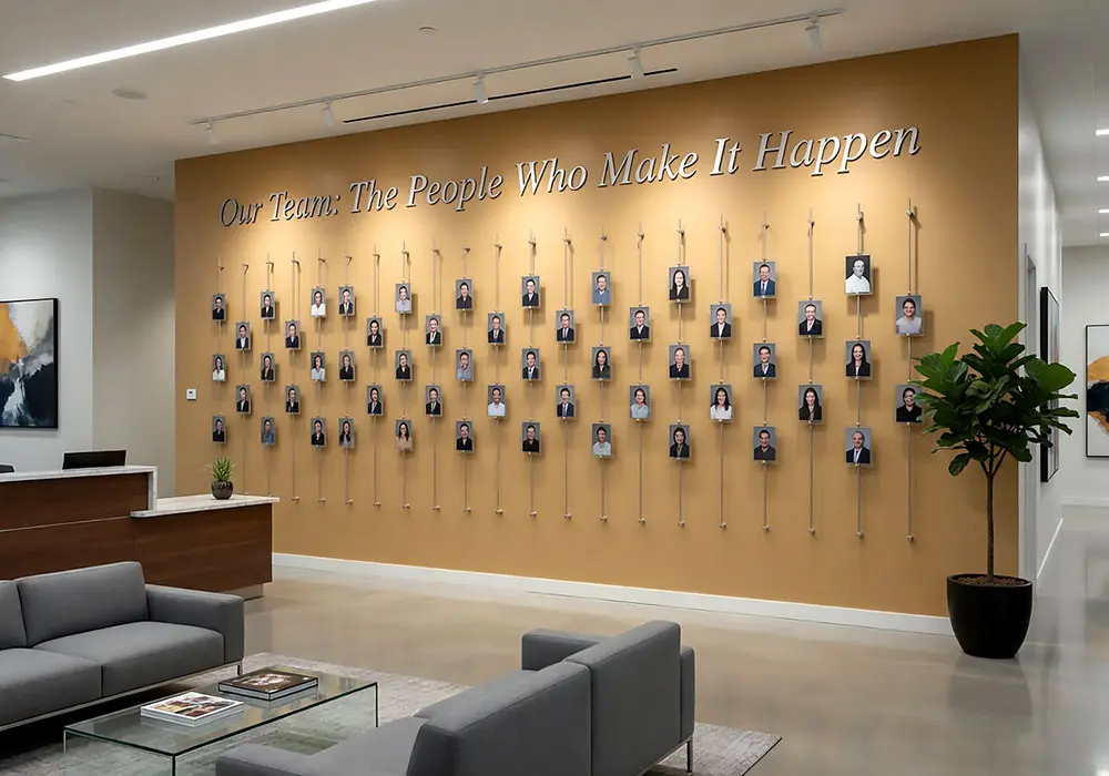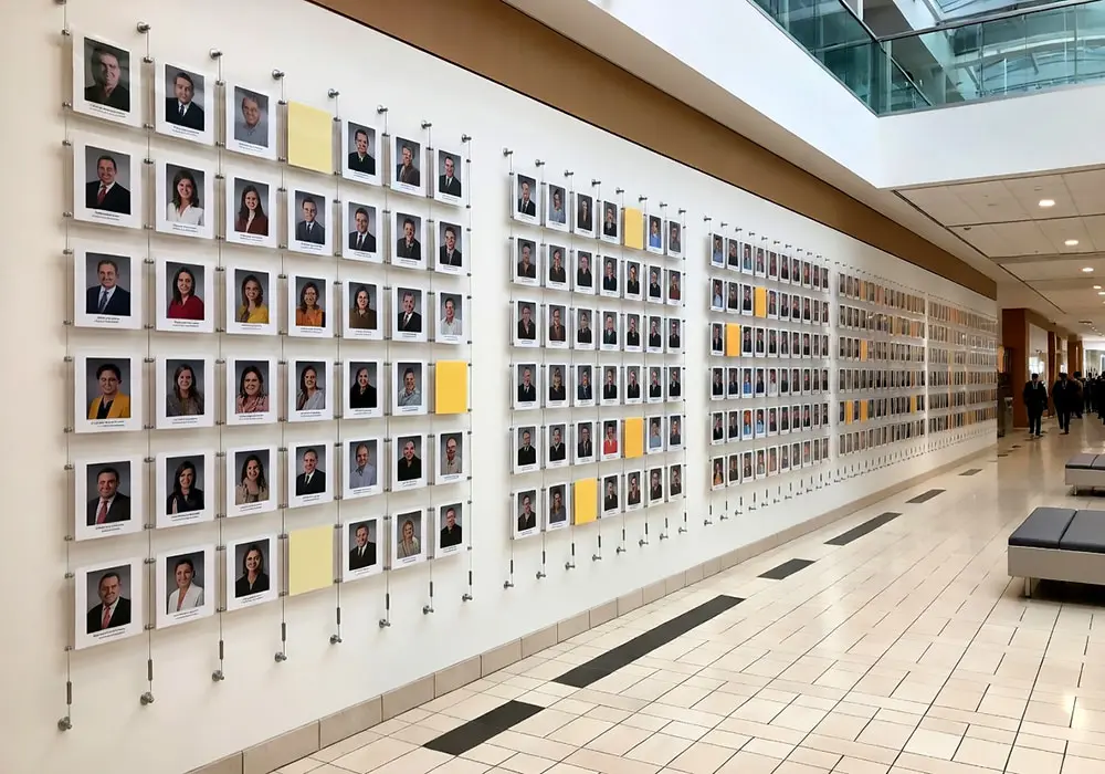 Corporate Employee Photo Wall Display – Wall-to-Wall Cable System with Interchangeable Acrylic Holders
