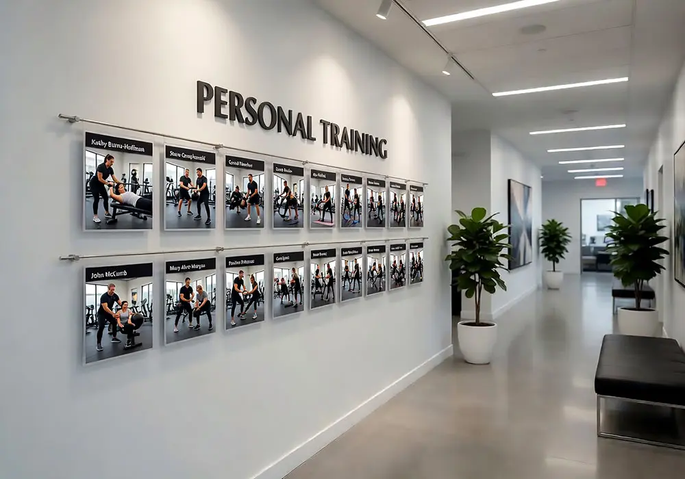 Employee Photo Wall Display with Hook-on Acrylic Holders and Horizontal Rod System – Flexible, quick-swap holders for fitness & wellness studios