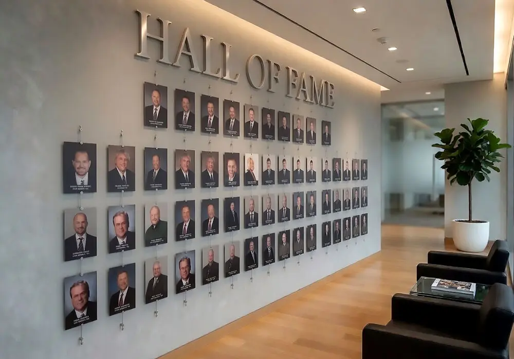 Corporate Employee Photo Wall Display – Wall-Mounted Horizontal Rod System with Non-Glare Acrylic Frames