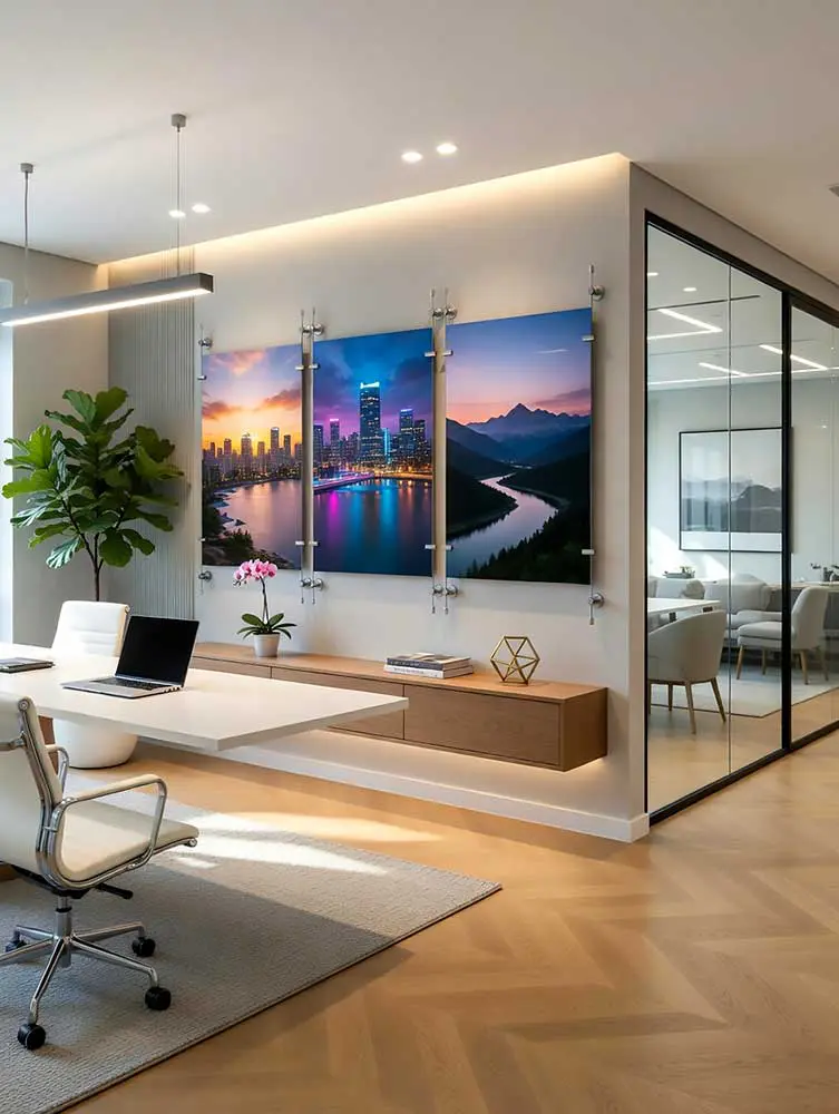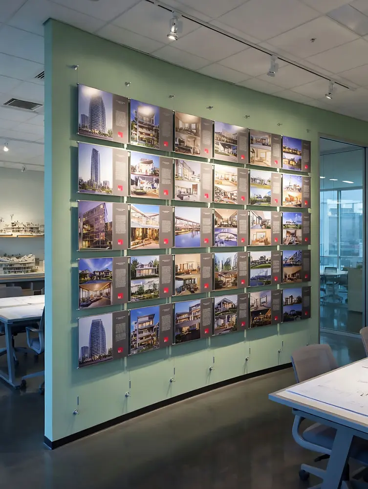 Render Photo Wall Display with Vertical Single-Rod Suspension – Custom sandwich acrylic frames optimized for architectural renders and design visuals
