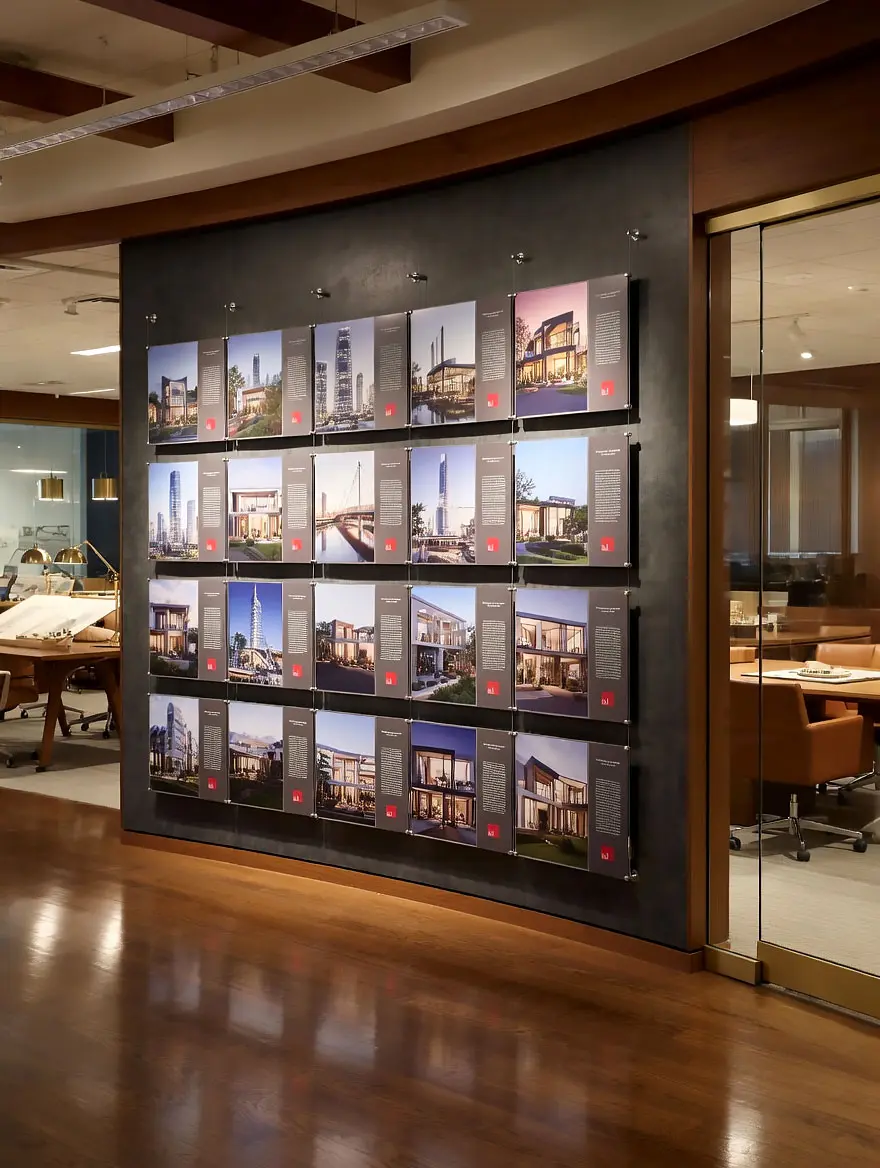 Corporate Render Photo Wall Display – Vertical single-rod system with sandwich acrylic frames in portrait/landscape