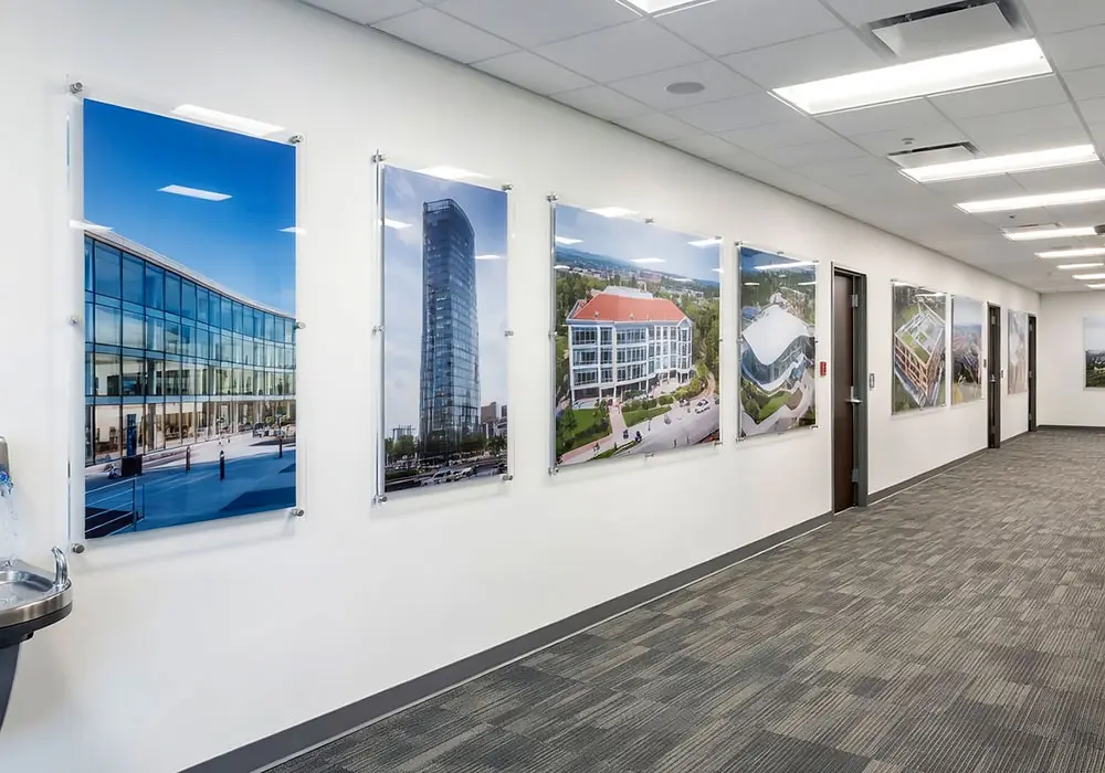 Oversize Architectural Photography Wall Display with Standoff Acrylic Frames – Frameless non-glare floating gallery for large-scale projects