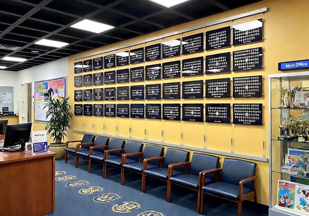 Student Recognition Wall Display with 1.5mm Cable Systems – Easy-access acrylic holders for quick student photo & award updates