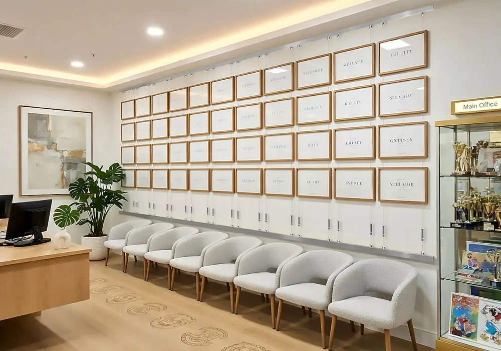 Certificate Wall Display with 1.5mm Cable Suspension – Wood frames in various finishes for flexible office presentation