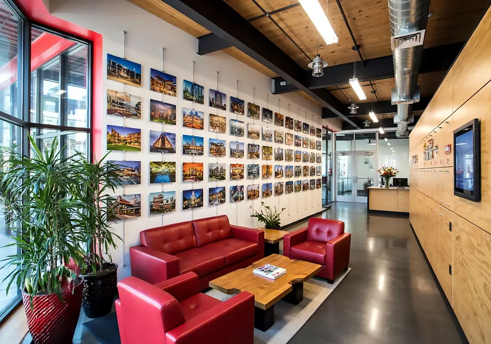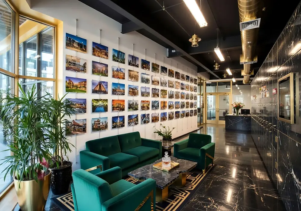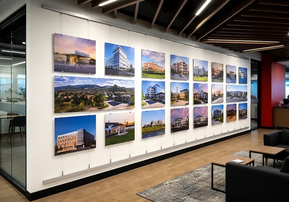 Render Photo Wall Display with Vertical Single-Rod Suspension – Custom sandwich acrylic frames optimized for architectural renders and design visuals
