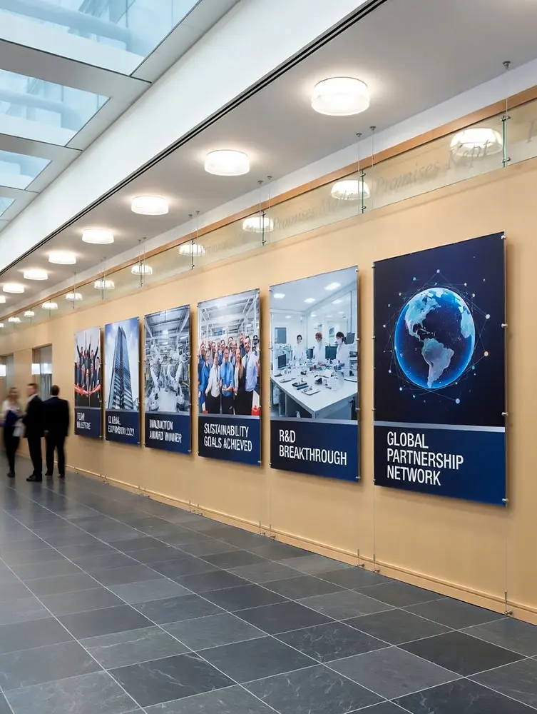 Use cable suspended acrylic frames to present important information such as announcements, event schedules, and financial posters in a clear and accessible way.