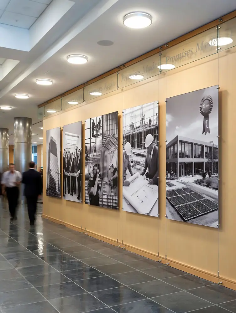 Cable suspensions are ideal for displaying historical photos, news clippings, and other memorabilia that capture pivotal moments in your company’s history.