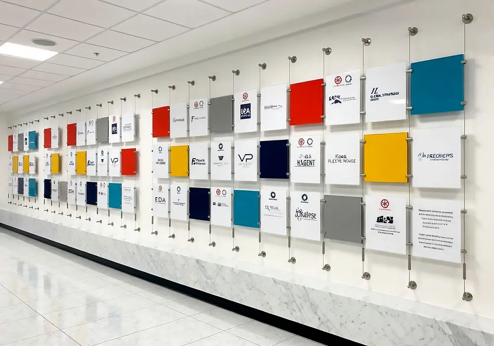 Employee Recognition Wall Display with 1.5mm Cable Systems – Easy-access acrylic holders with optional dimensional letters & logo panels