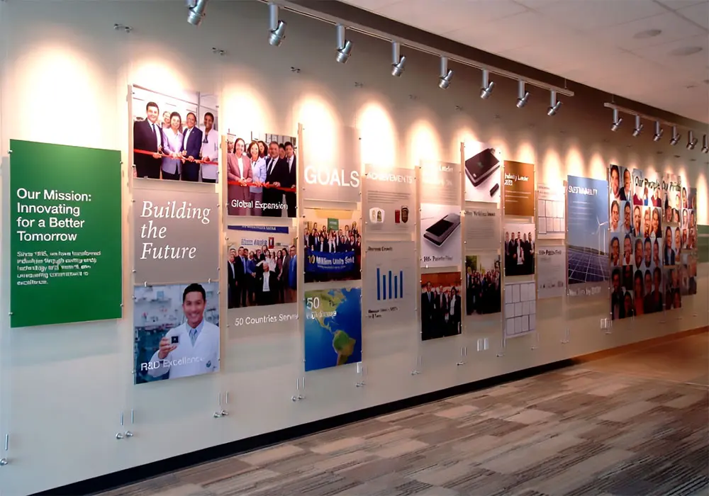 Corporate Milestone-Timeline Display – Ceiling/Floor Rail Cable System with Non-Glare Acrylic Frames & Signage
