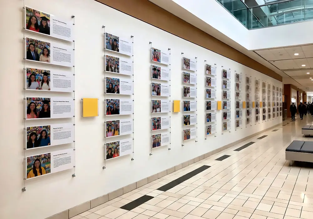Student Recognition Wall Display with 1.5mm Cable Systems – Easy-access acrylic holders for quick student photo & award updates