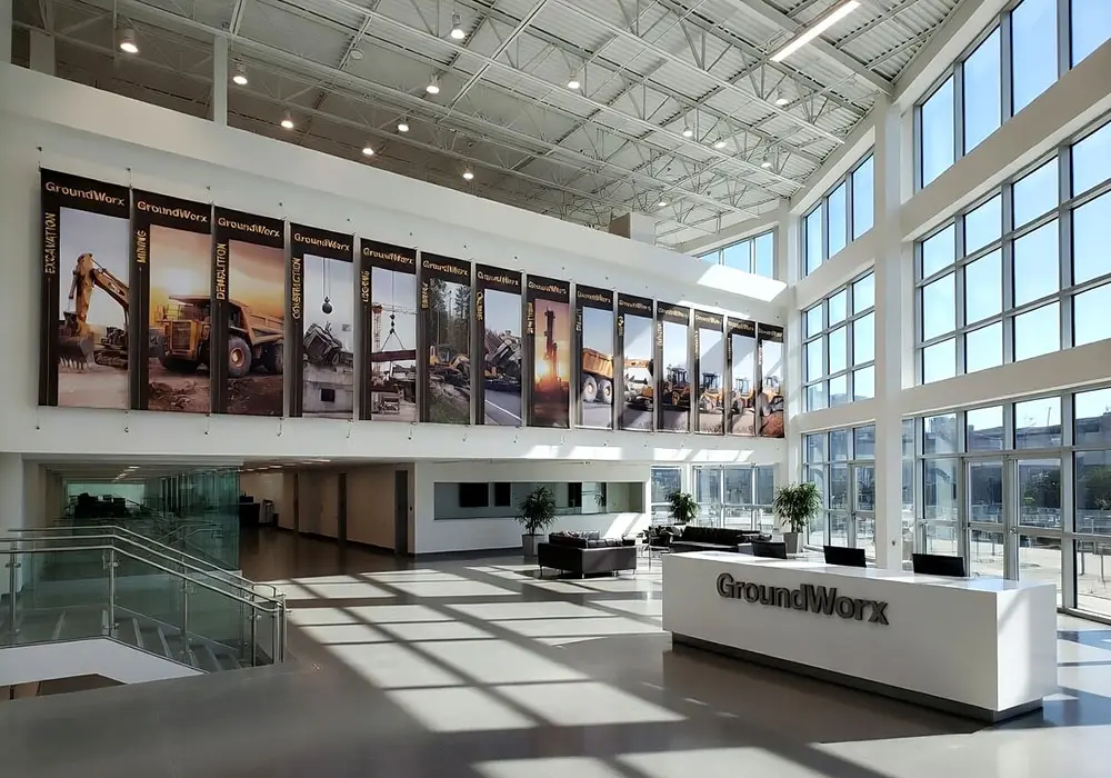 Corporate Banner Graphics Display – Cable Suspended Vinyl Banners with Wall Projection
