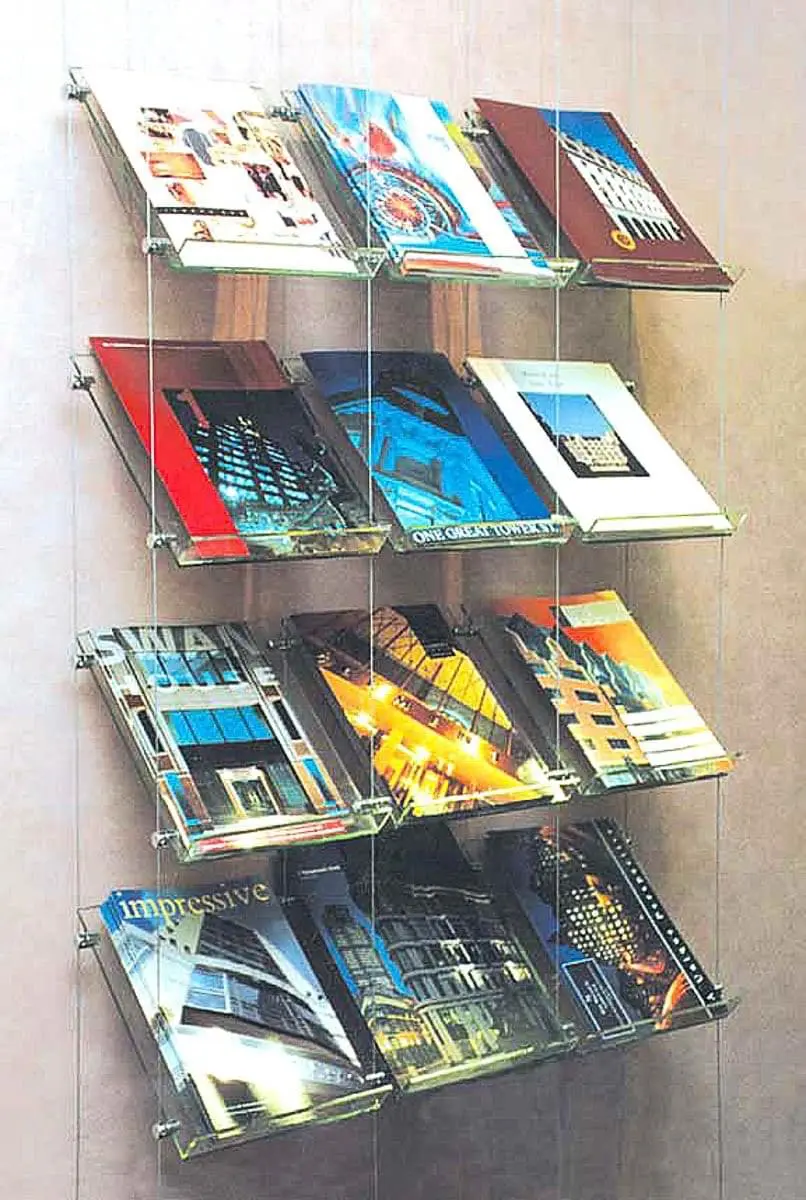 Sloped acrylic shelf display mounted with wall-to-wall cable system is a perfect solution for displaying catalogs, magazines, brochures, books, newspapers, post cards, etc.