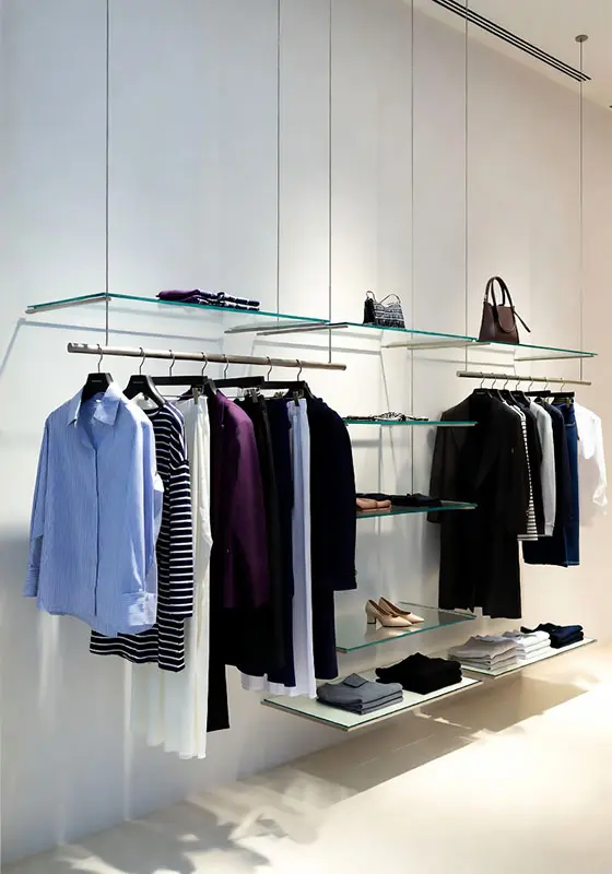 Use cable/rod suspended clothes rail systems to suspend garments, dresses, or coats from hanging rails integrated with glass shelves for accessories such as scarves, bags, or shoes.