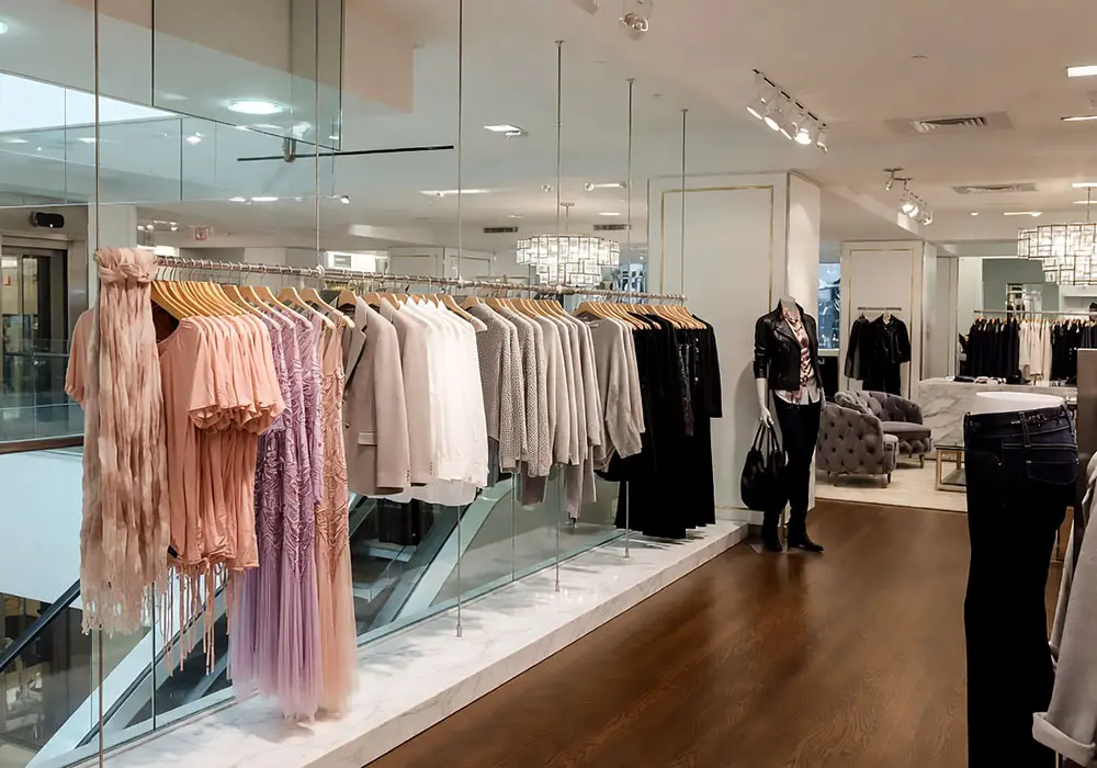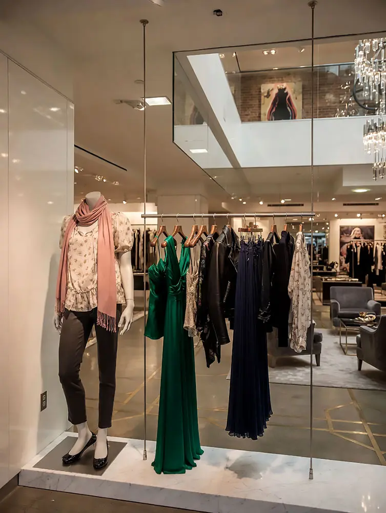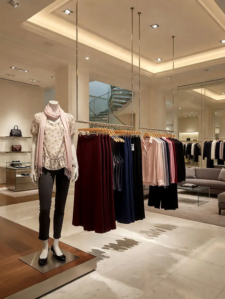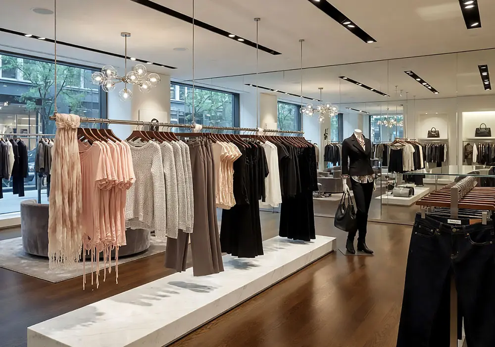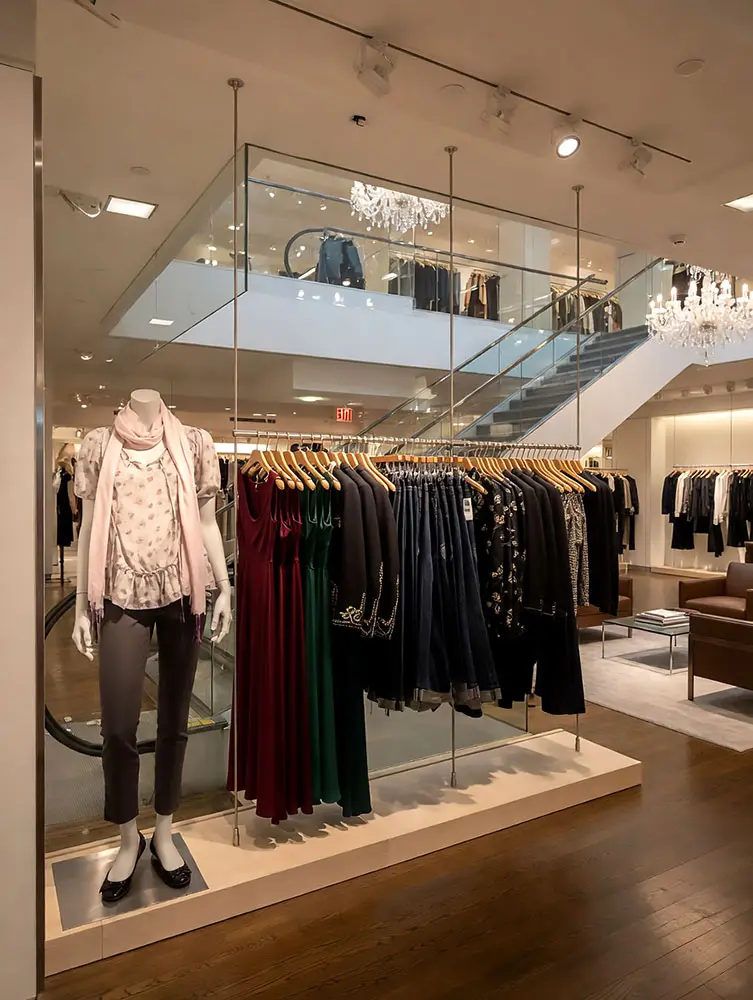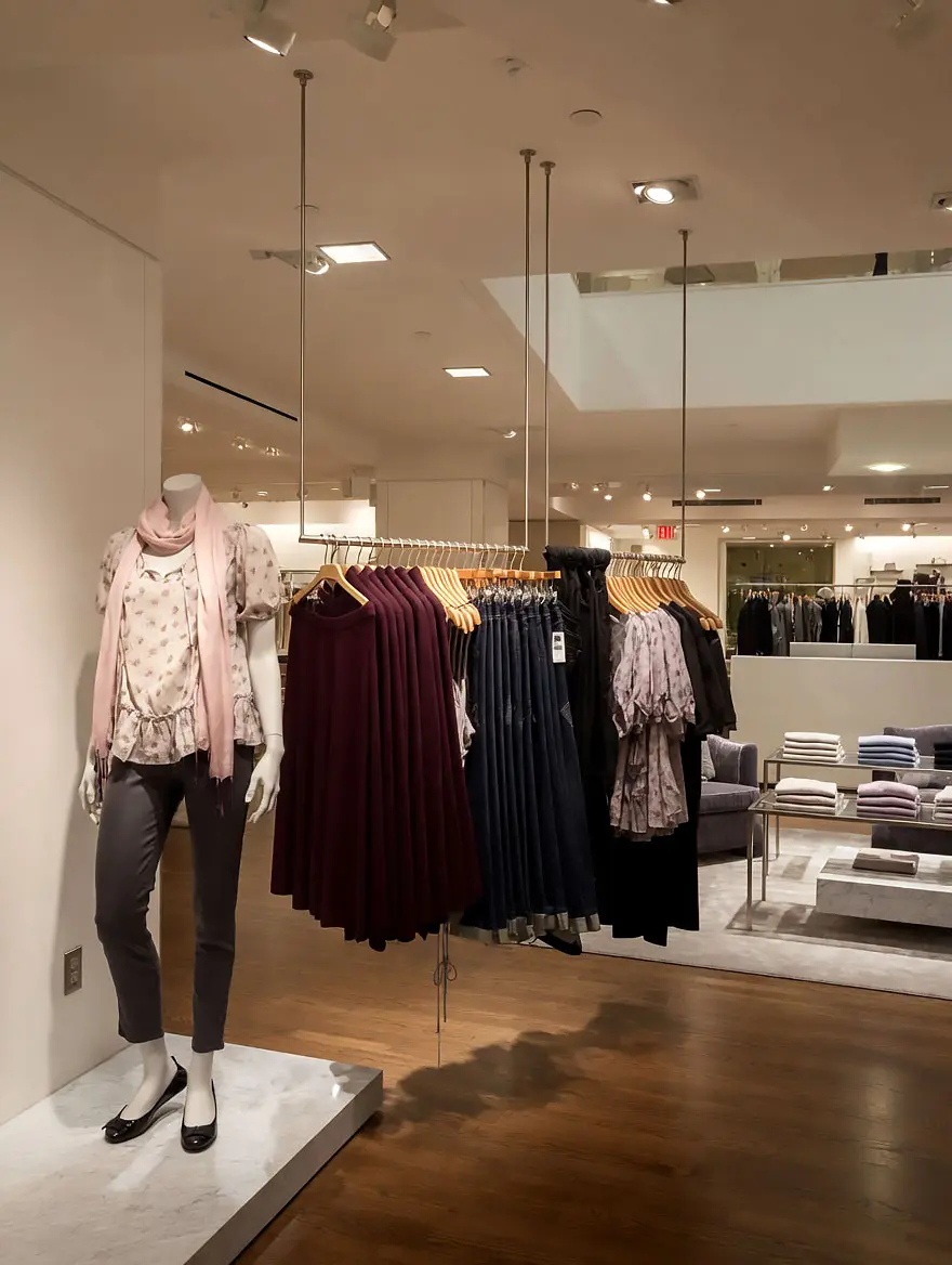 Space-Efficient Clothing Rail Display – Vertical rod suspension for open, airy garment merchandising