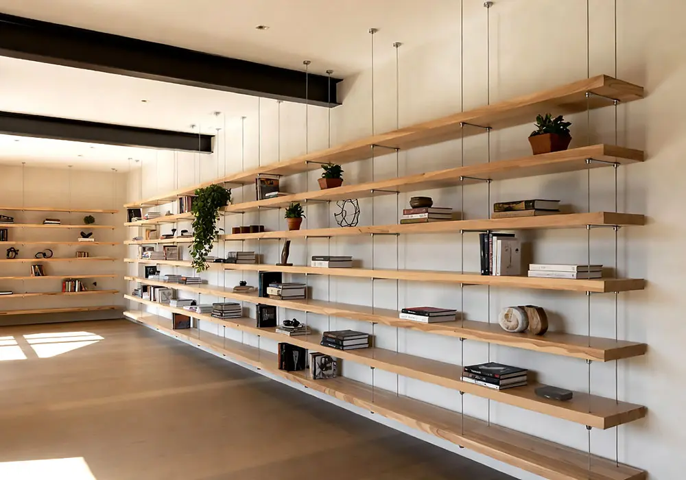 Floating Custom Wood Shelves – Cable-suspended 3mm system with level or staggered layouts