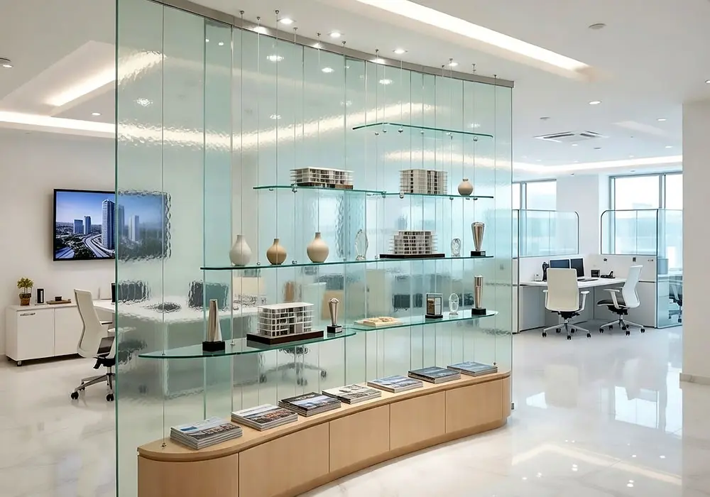 Floating Custom Glass Shelves – 3mm cable suspension with textured glass partition backdrop