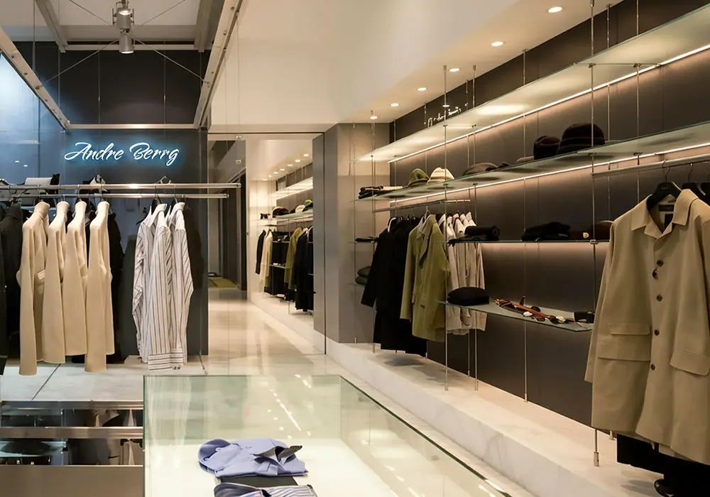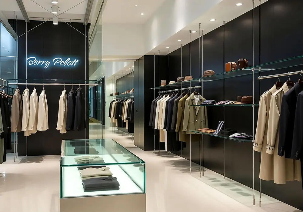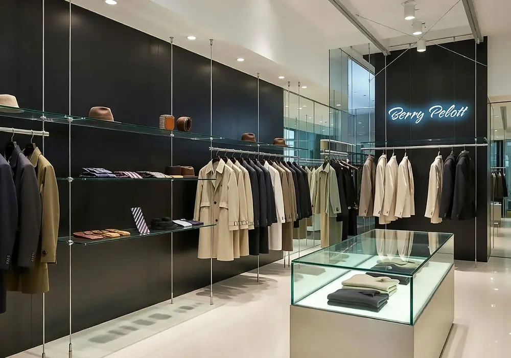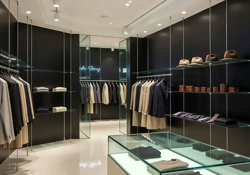 Glass Shelf Retail Display with Suspended Clothing Rails – Custom tempered glass on 6mm/10mm ceiling-to-floor rod systems