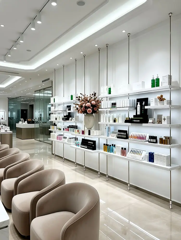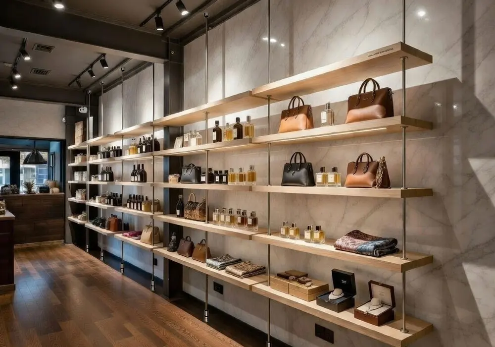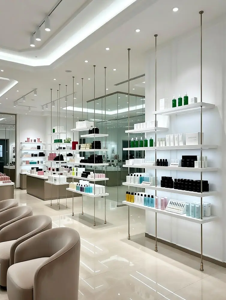 Retail Display with Custom Shelves Suspended on 10mm Rod Systems – Thick acrylic or composite floating shelves with ceiling-to-floor or wall-supported options