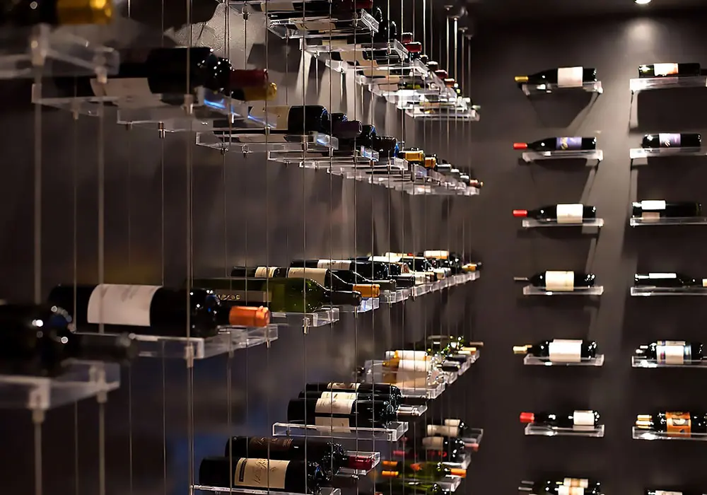 Floating Acrylic Block Shelves – Cable-suspended custom nest design with polished clear edges for wine bottles