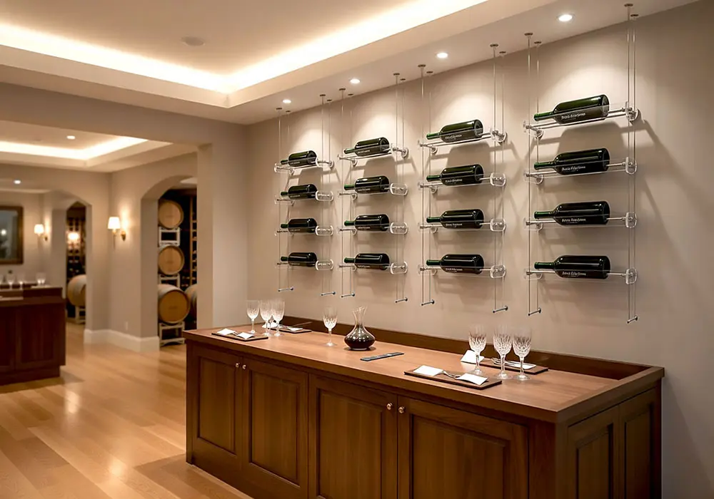 Floating Rod Suspended Wine Shelves – Custom glass or acrylic panels with ceiling-to-floor or ceiling-to-counter suspension