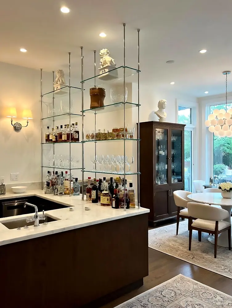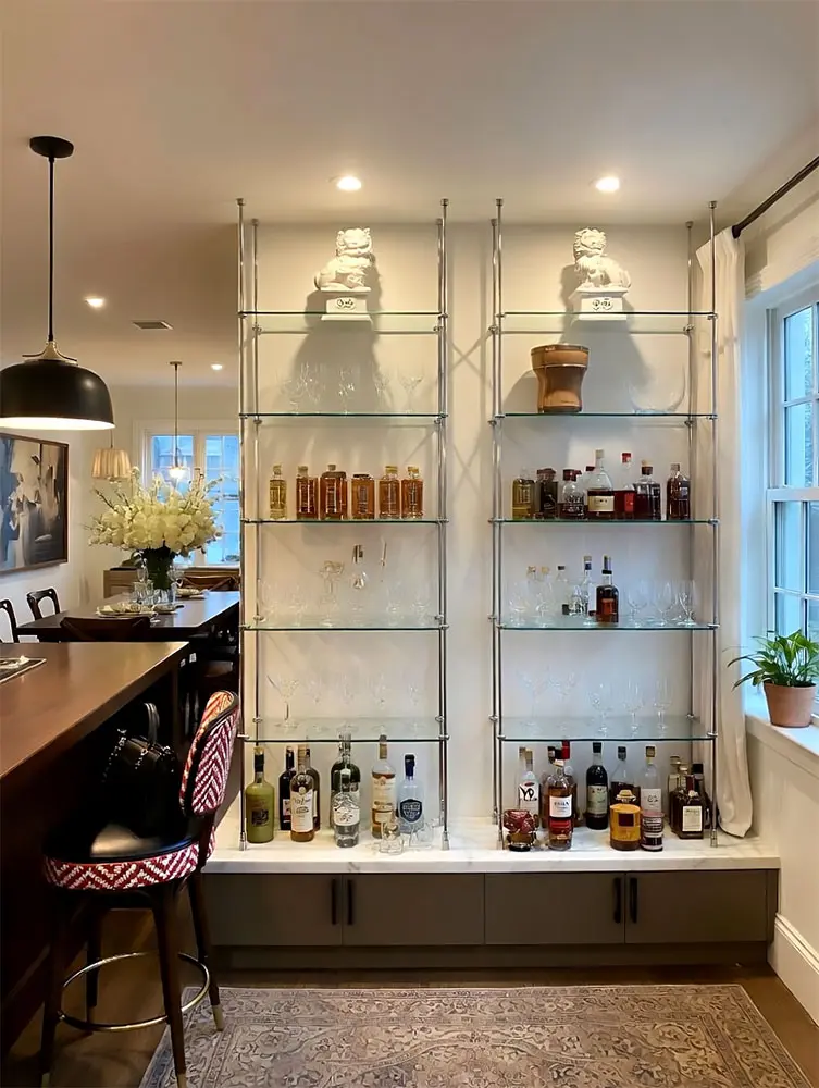 Our glass bar shelves suspended with cable/rod hanging systems offer a perfect blend of elegance, durability, and versatility, transforming your bar area into a stunning showcase of style and sophistication.