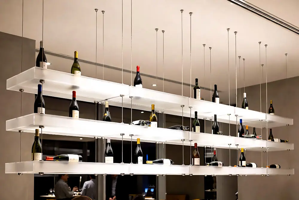 Rod Suspended Glass Shelves – Premium wine display system with ceiling-to-floor or ceiling-to-counter cables