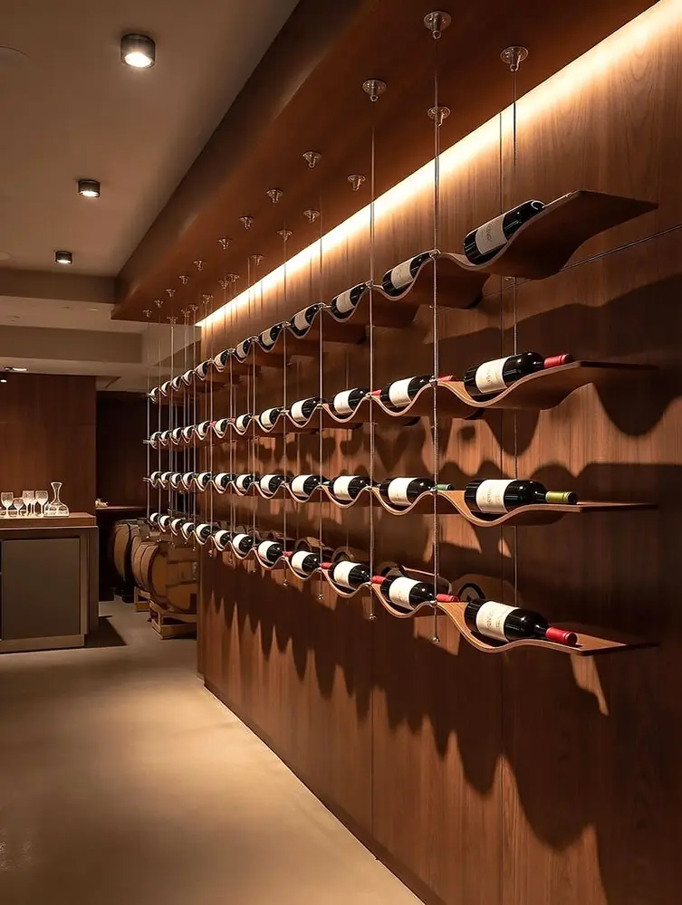 Cable-Suspended Custom Wood Shelves for Wine Bottle Showcasing – Wave-designed wood-laminate shelves with bottle cut-outs
