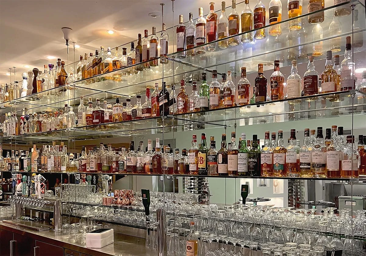Showcase premium spirits and unique glassware in a visually appealing manner.